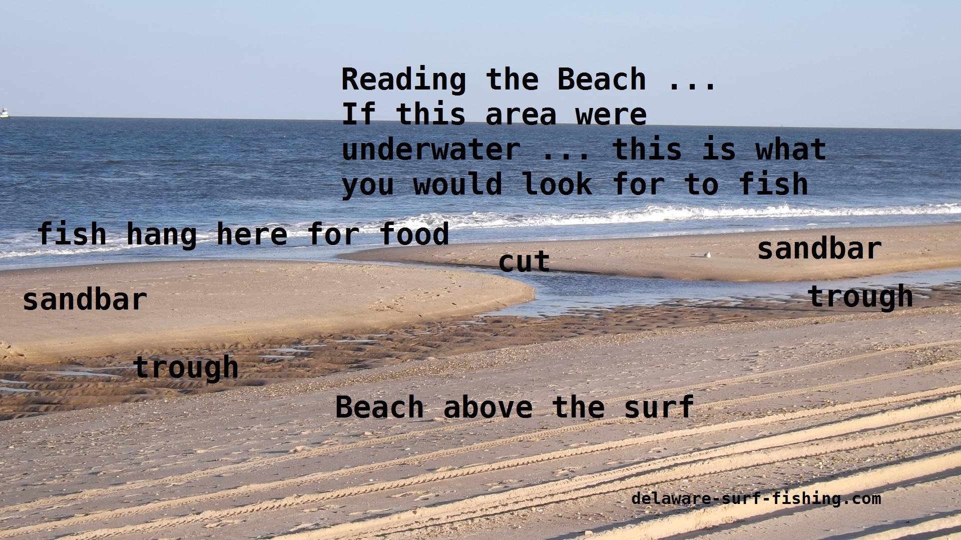 One of the most difficult things to locate is a good cut in the Delaware surf. They are usually subtle,and there are several distinct cuts that many know the location. The “cut” is the area where water that is pushed across two sandbars drains back into the ocean. Between the sandbars.