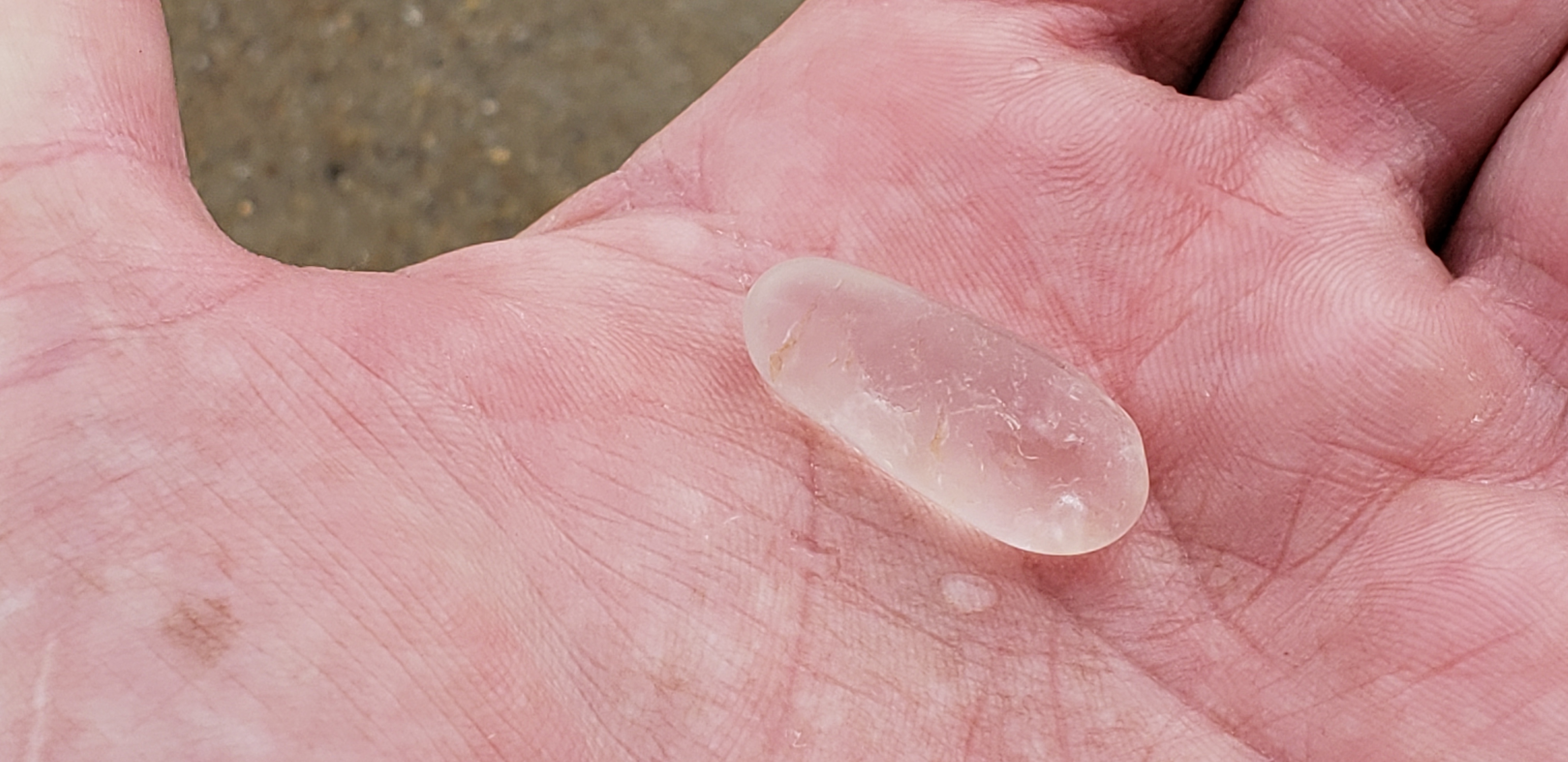 Delaware Bay Diamonds are easy enough to find, they look like round clear pebbles when they are wet. If you find one like the large one I found, look for veins in the crystal otherwise it could be a glass bottle stopper or well worn down thick sea glass. That was debate for a bit during lunch on Sunday. The Diamond won since it had veins and cracks.