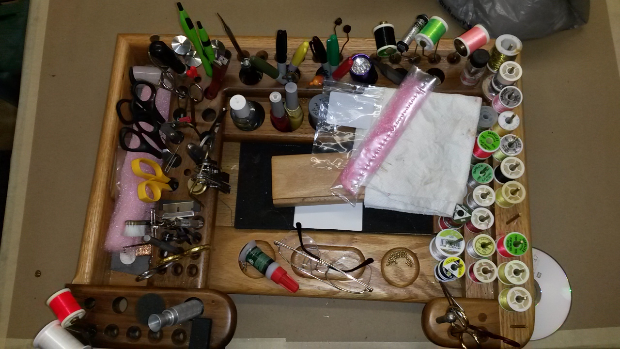 Last Saturday was not unlike any other Saturday, the boys were set up, the coffee was hot and donuts were a plenty. Every Saturday I attend, I learn something new, or see something different. When I first arrived Steve Halstead was setting up on the table just in front of the door. He had two pieces of wood with him that were once a bamboo cutting board that he cut in half. He had a hole drilled on one end and a lot of small holes on one side with a piece of cork glued to the top. Once he had his vice set up he put the bag on it that catches all the trash from tying. The little pieces of feather, hair and what not that comes off these flies while making them. Fly tying can be messy. The large hole on the board fit the stem to the vice. He placed that above the clamp for the bag and now he had a table or deck to hold his scissors, bobbins and other tying tools. It was really neat to see something that simple used to create a nicely organized tie station. Some of these boys have large wooden boxes or tie stations they have made. You want to hold everything you need sometimes yo have to create what is needed.