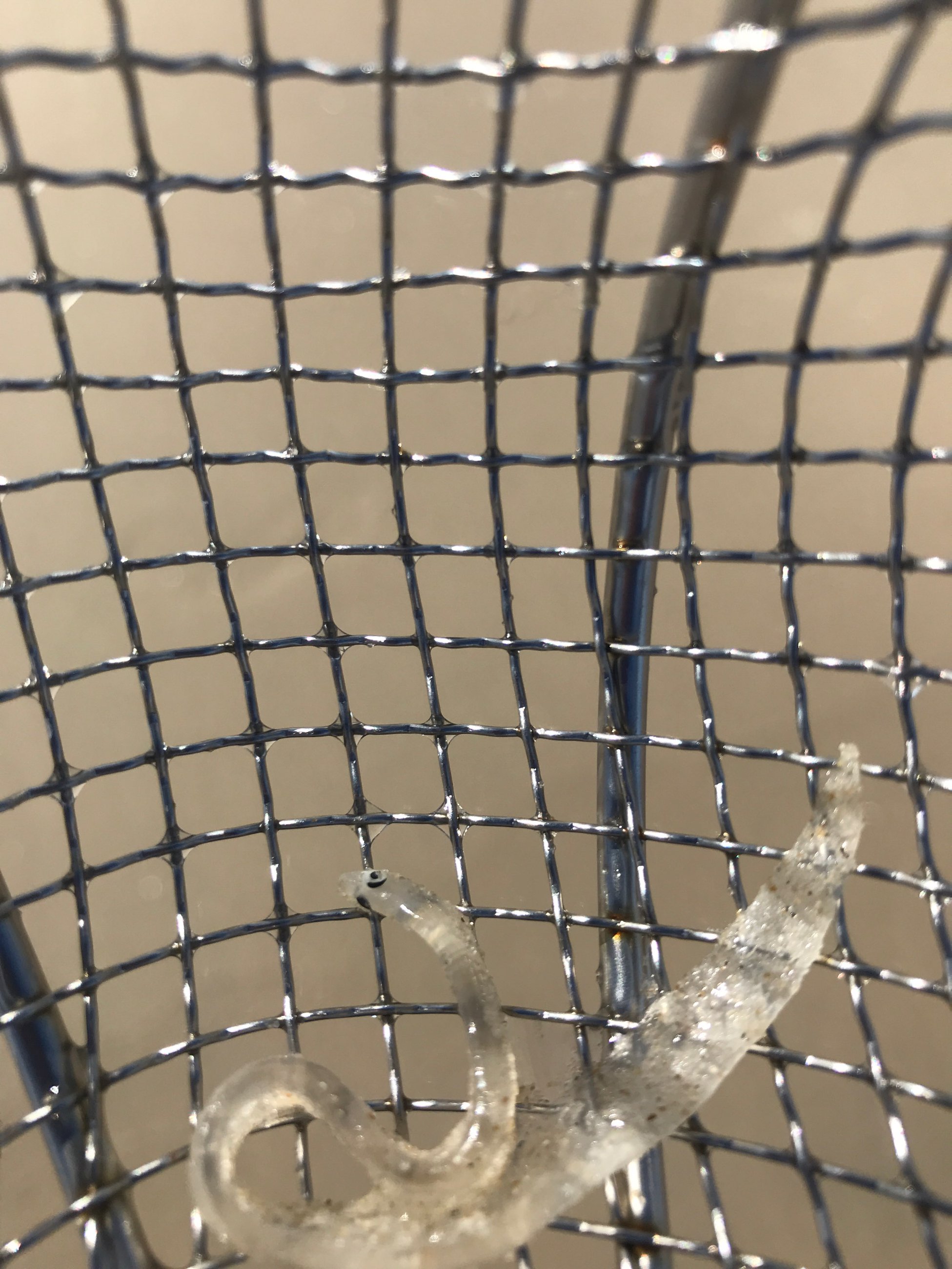 Today and last week elvers or glass eels were found in the surf. These are traveling back to the freshwater ponds of Delmarva to mature. They are illegal to keep , or collect. Lynne caught one last week after the beach clean up scooping for sea glass and shells. They have been in the surf for a while, probably feeding the striped bass.