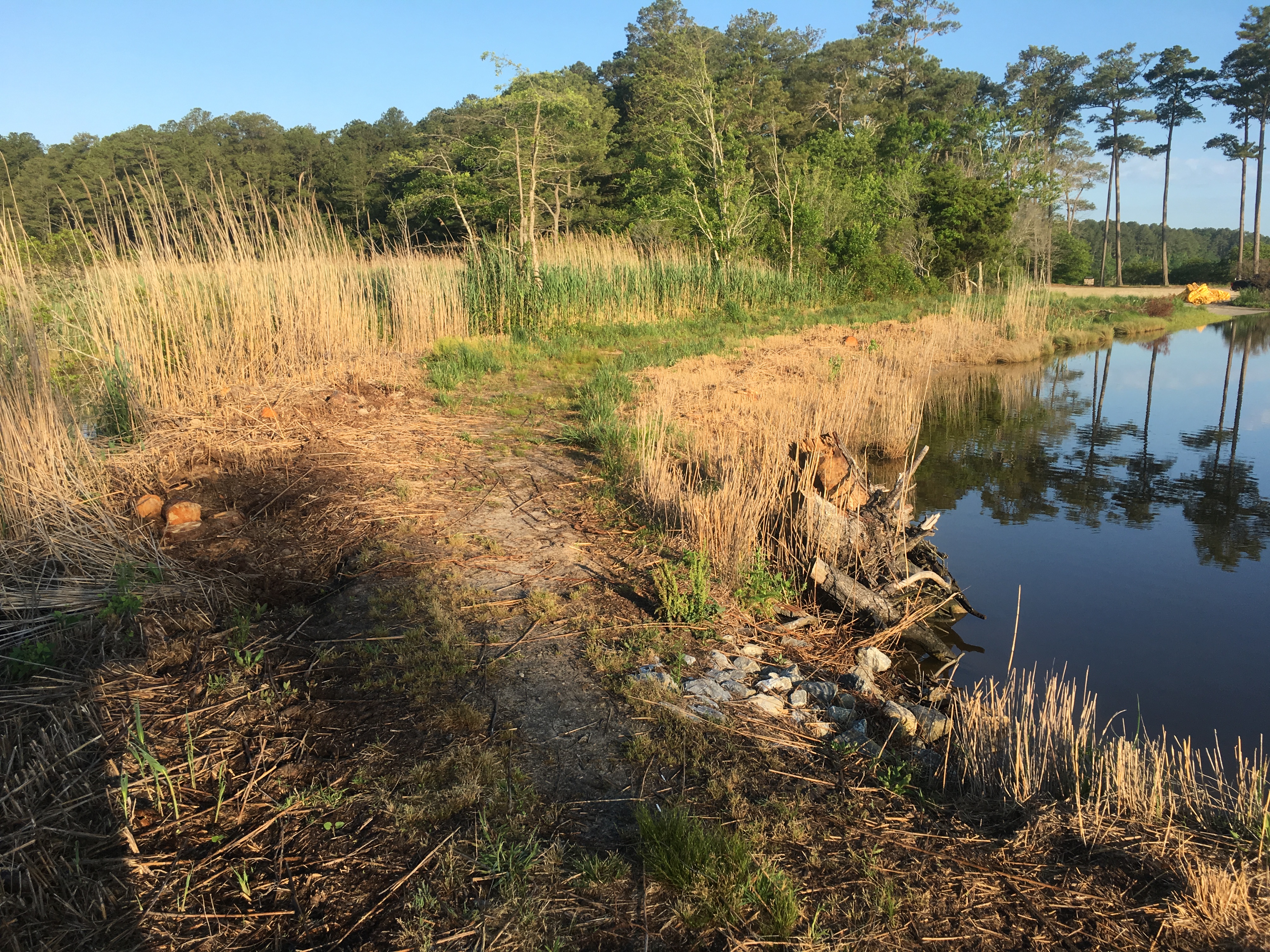 Bob Collins, the Center’s Program Manager, described the importance of this living shoreline project. “A thin berm of upland separating 35 Acre Pond, a freshwater impoundment, and Miller Creek, a tributary of Little Assawoman Bay, was eroding. If breached, the freshwater impoundment would have been infiltrated with salty water. This would have eliminated freshwater aquatic plants that serve as a food source for migrating waterfowl. A low rock sill was installed about 30 feet into Miller Creek, and the area between the sill and the eroding berm was filled with sand and planted with salt marsh grasses. As a result, 13,000 square feet of salt marsh habitat was created as a buffer for boat wakes and storms.”