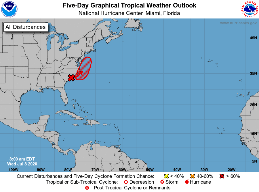 Hunter Outten … We are paying close attention to an area of disturbed weather along the Carolina coastlines that has a high chance of becoming our next Tropical Depression. This area of disturbed weather is expected to move northeastward into the Gulf Stream off the coast of Delmarva.
