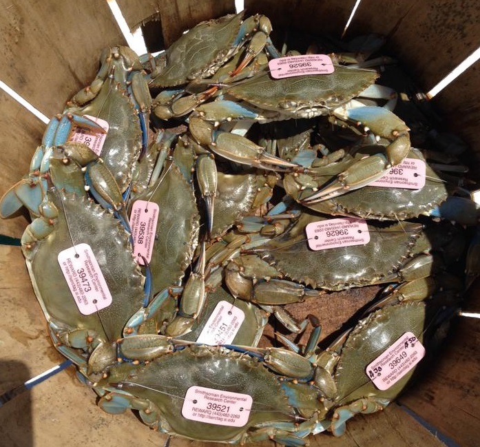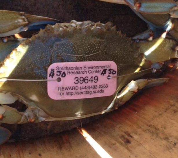 You have heard of, seen and even found tagged horseshoe crabs, but have you ever seen or found a tagged blue crab? Lori Wyatt and her crew were crabbing in Delaware recently and came across a tagged blue claw crab, but the day didn’t end with that one, eventually they had thirteen of these tagged crabs. They called the number on the tags and reported their catch. There is a reward for reporting the tags from five up to fifty dollars for a reported and sometimes returned specimen. So not only did they have a great day crabbing with a nice feast for their efforts, but they also made a few bucks to boot. I was rather intrigued by these tags since blue crabs molt, how did the tag stay on? I wanted to know how and why this program was started. From the SERC website … “Thank you for your participation in the Smithsonian Environmental Research Center’s blue crab research program. Our blue crab tracking studies focus on understanding habitat use and crab migrations, as well as better understanding fishery dynamics. To learn more about SERC’s blue crab research, visit our Blue Crab Ecology website and follow our crab tracking updates at the Blue Crab Blog. Our blue crab tags consist of 1″x 2″ hard pink or white plastic disks attached to the back of the crab with stainless steel wire wound around the spines. High-reward tags ($50) are marked accordingly on both sides of the tag.” If you find a tagged crab follow the instructions on the tag, the pink tags they just want the data and the white tags they want the whole crab. Recreational crabbers in Maryland are not allowed to keep mature female crabs, just send in the data if it is a white tag. Commercial crabbers can retain mature female crabs and are encouraged to send in the whole specimen.