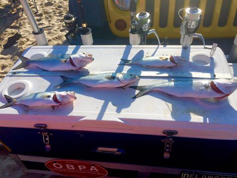Pompano were in the surf hitting bloodworms on top and bottom rigs at Cape Henlopen yesterday. Good sized ones for the grill. Just gut it and grill it, but slice the sides open a tad and add pepper first, they are very tasty. Kingfish are still the hot bite in the surf. There has been some decent blues action when the schools swim by the beach, hitting mullet rigs. Spot and croaker action at the Cape Henlopen fishing pier is decent. The inland bays are loaded with croaker, especially along the rock jetties and structure. There are a plethora of small sea robins around the inland bays as well. Great flounder bait if you strip them out and they are good to eat as well. The smaller ones are inshore and the larger ones are offshore at places like the old grounds and wreck or reef sites. Sea bass action is still decent out there for flounder anglers.